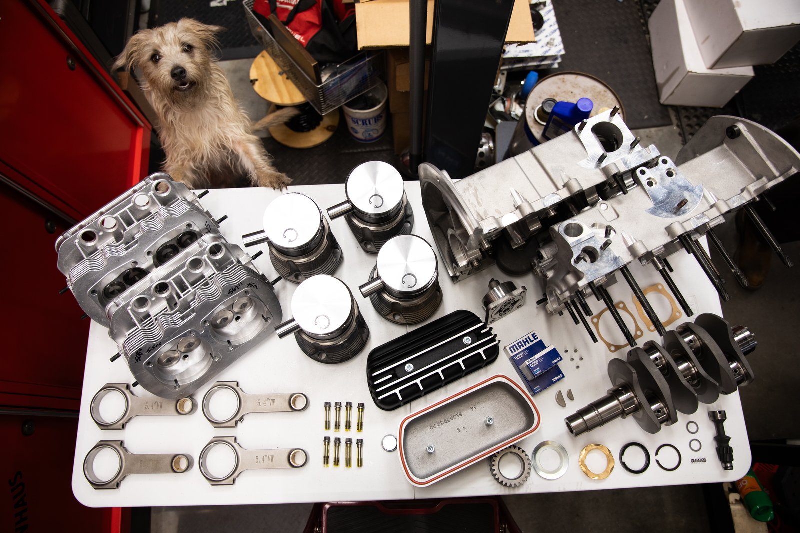 Major components laid out prior to assembly, including the Autolinea aluminum engine case and AA Performance Products rotating assembly.